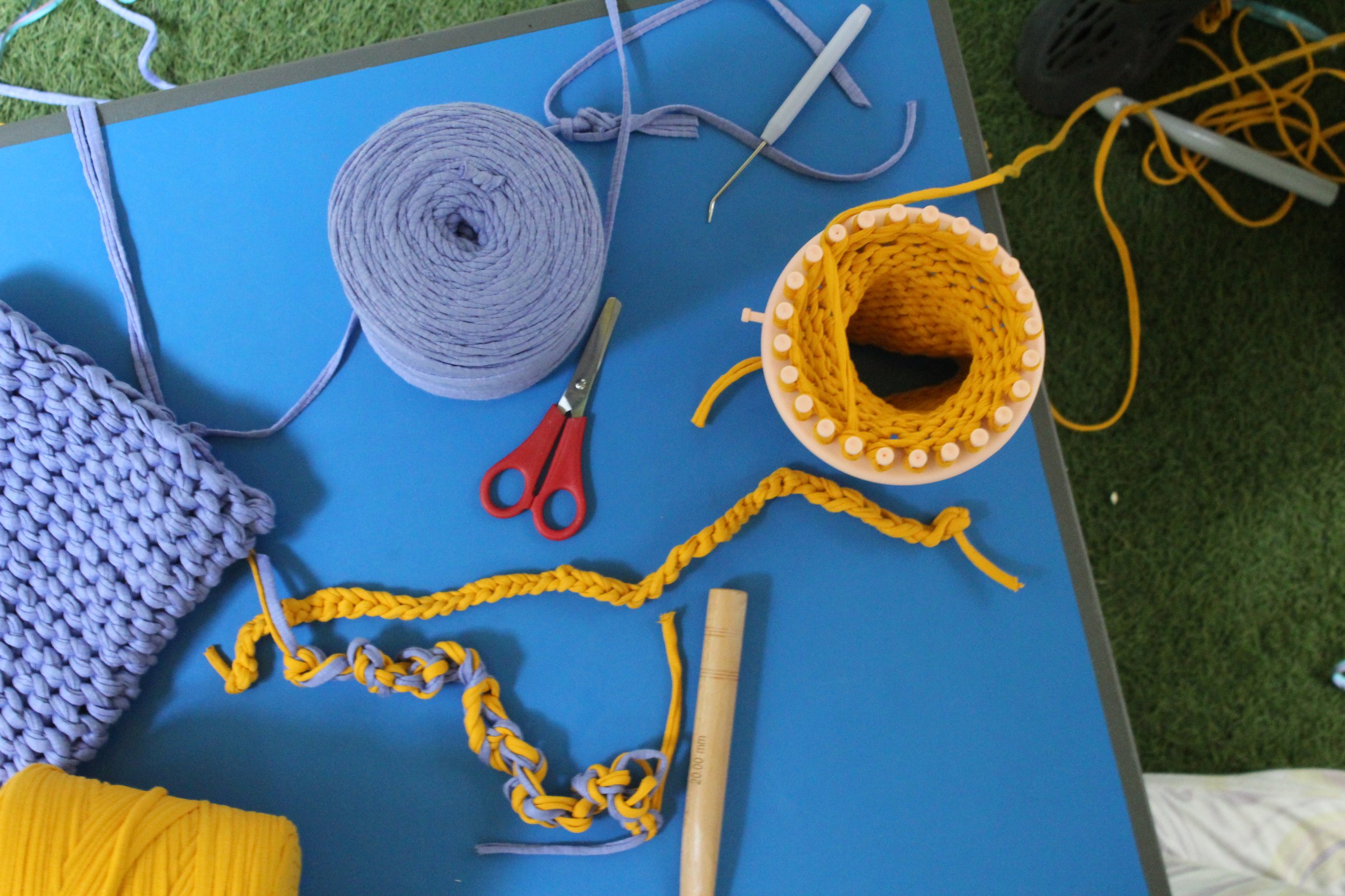 A blue table with purple and yellow crochet pieces and yarn, a loom and a pair of red children’s scissors and a giant wooden crochet needle.